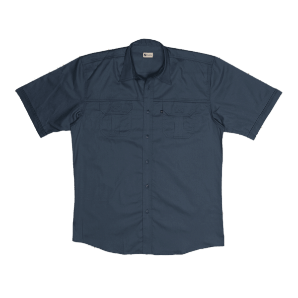 Designed for practicality, it features dual chest pockets with secure Velcro flap closures, a pen division for quick access, and double-needle topstitching for lasting durability. The classic soft fused collar and mock cuffs deliver a polished look, while the rounded shirt tail ensures a comfortable fit both tucked in or out.